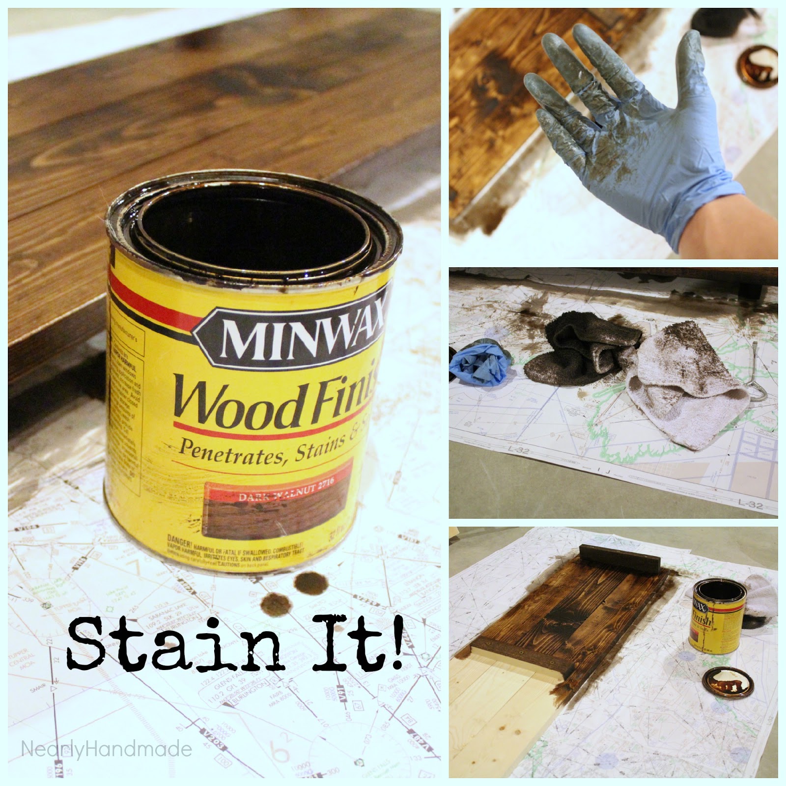 We had some left over stain from when we built our nightstands so I used that for this bath table. I put on some latex gloves to keep my fingers pretty ;) and used a couple of old rags to apply it evenly. I let the stain sit for about 15 minutes then took another clean rag and wiped off any excess.